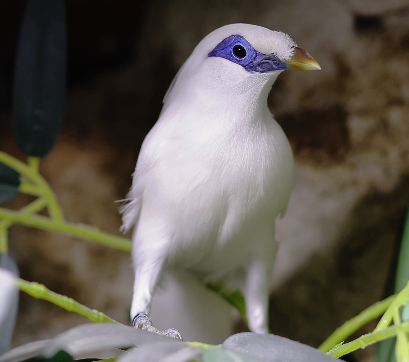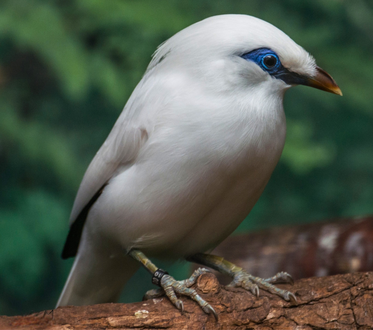 Niewielki ptak z rodziny szpaków. Wyróżnia go upierzenie – jest białe z wyjątkiem czarnych końcówek lotek i sterówek. Tęczówka jest szara, biaława lub brązowa, a naga skóra wokół oczu i za okiem – koloru jasnobłękitnego. Dziób szary lub brązowy, a nogi niebieskie.
