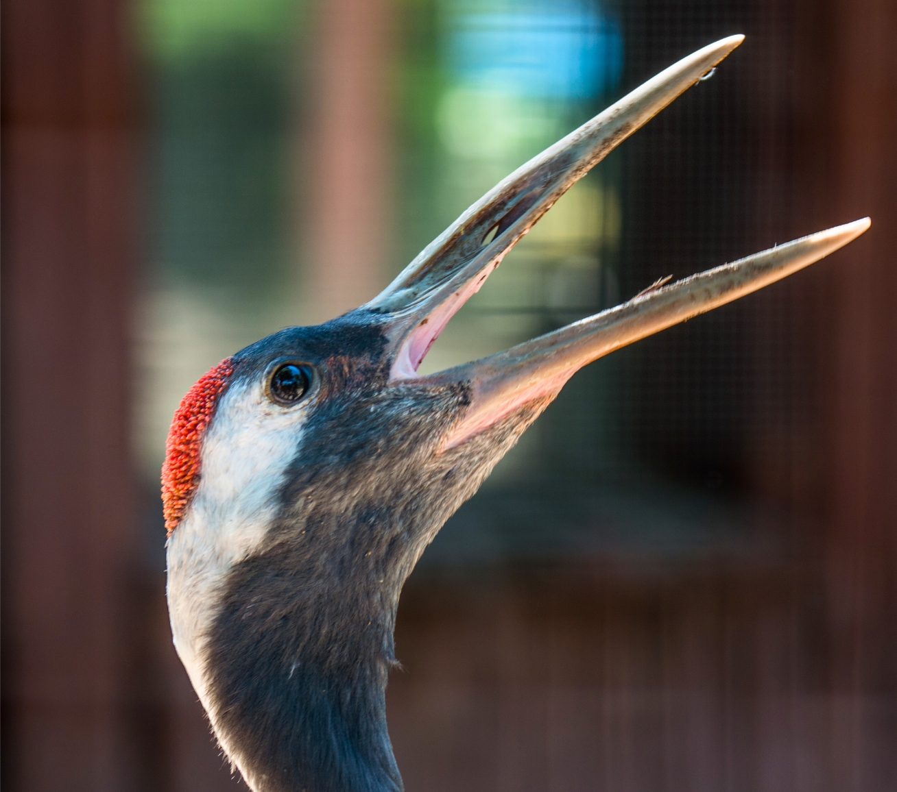 Upierzenie jest białe, z czarną szyją i głową. Na czubku głowy znajduje się charakterystyczna czerwona „czapeczka”, której kolor staje się jaskrawy, kiedy ptak jest pobudzony. Ogon jest biały – czarne pióra to lotki skrzydeł, które go przykrywają.