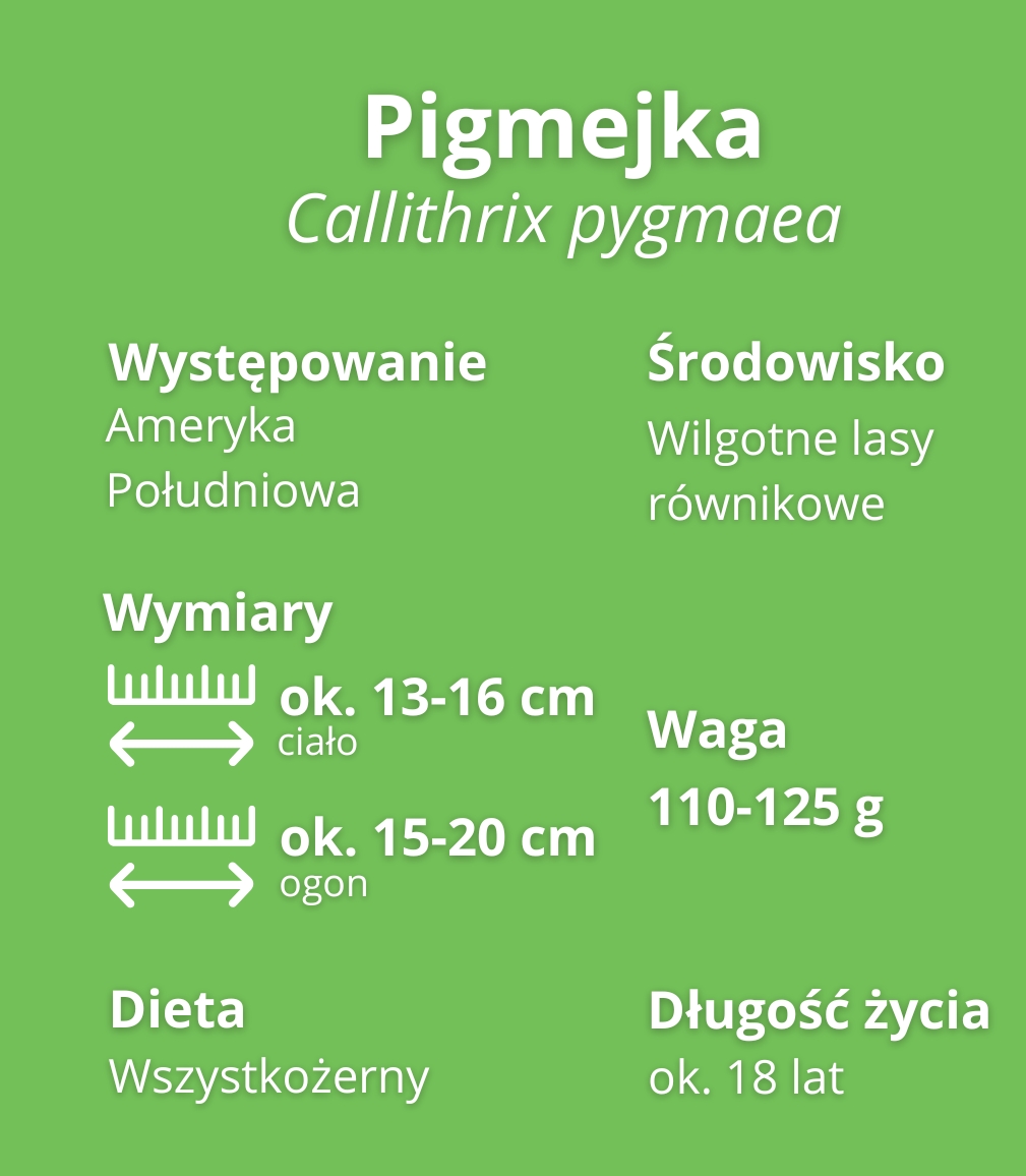 Pigmejka to najmniejsza małpka świata. Długość jej ciała to zaledwie 13–16 cm, ogona – ok. 15–20 cm, a waga sięga 110 – 124 g.
