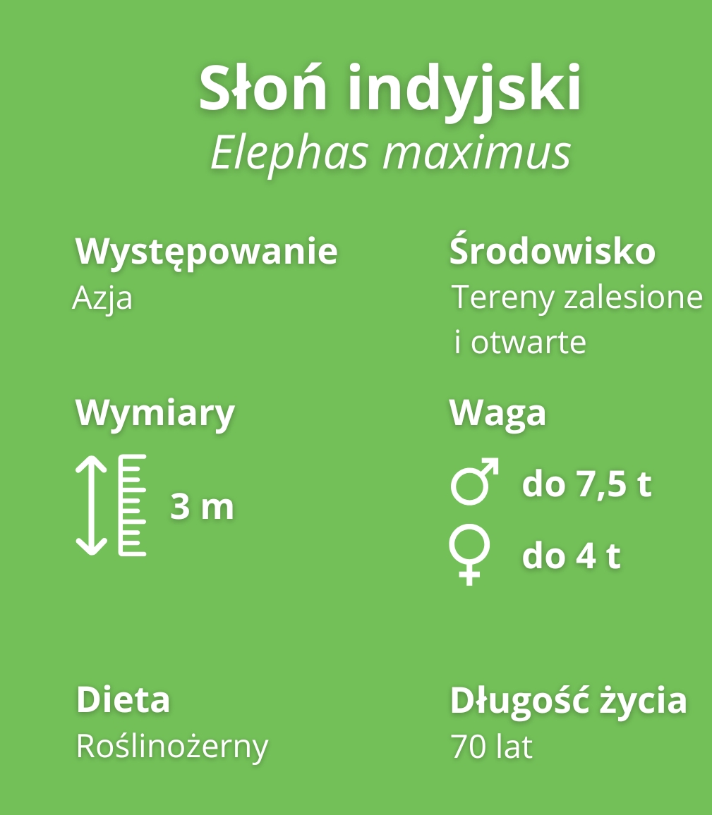 Słoń indyjski to ssak z rzędu trąbowców, jeden z trzech żyjących gatunków rodziny słoniowatych. Wyróżnia się 3 podgatunki: bengalski (Indie), sumatrzański (Sumatra) i cejloński (Sri Lanka).