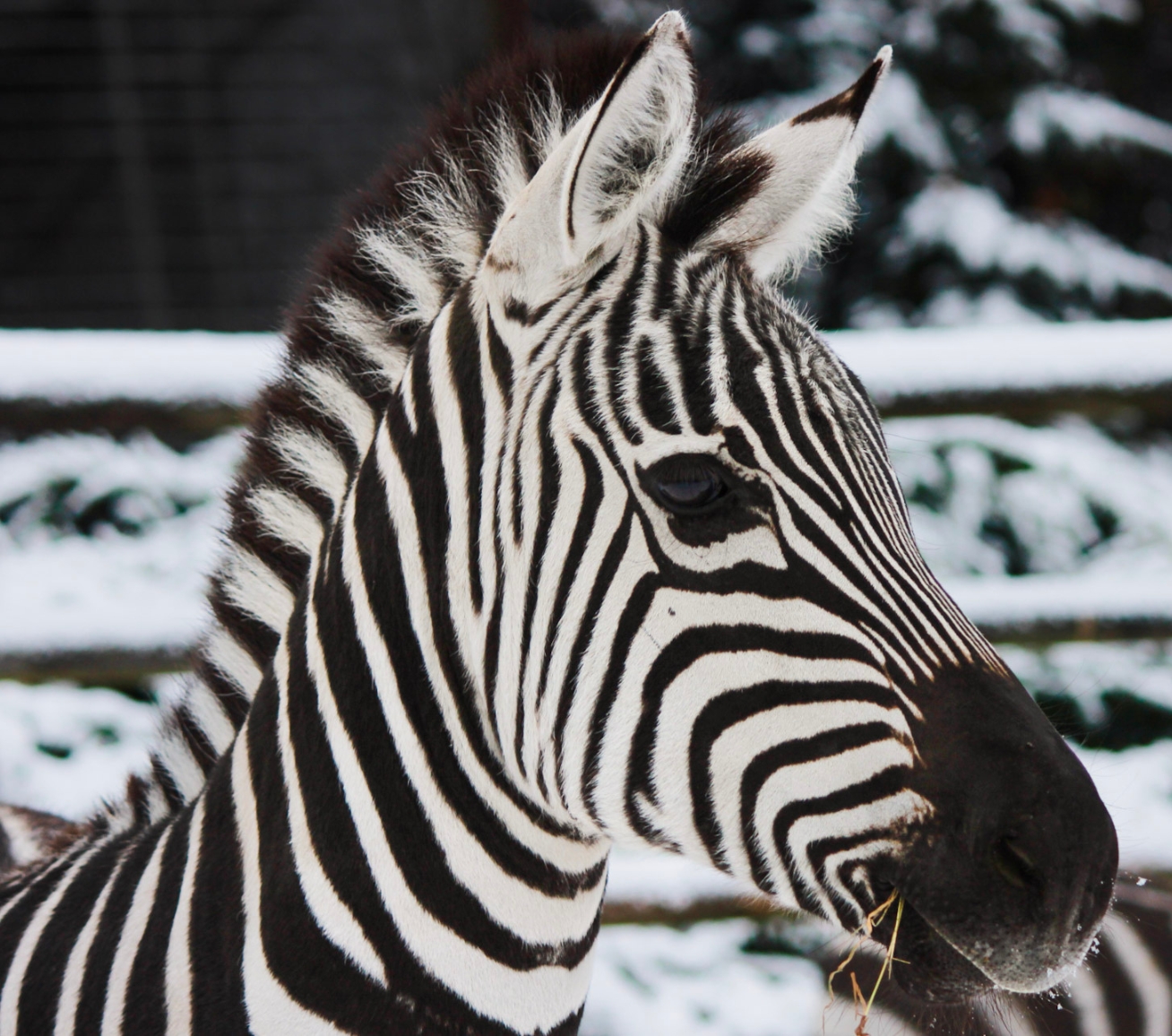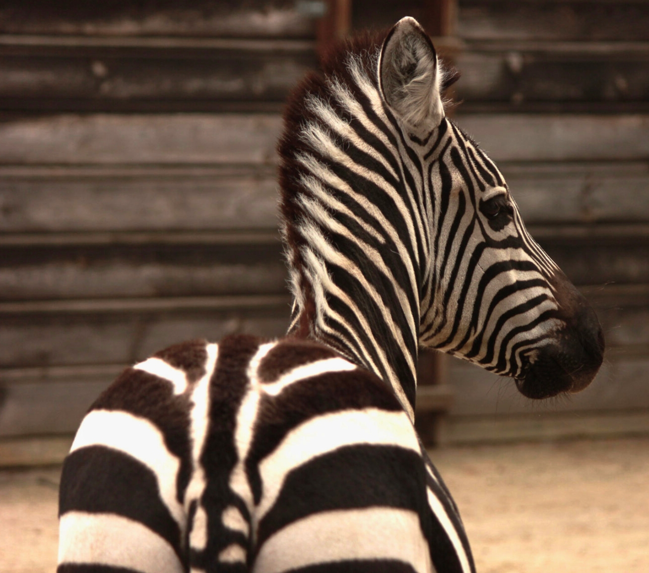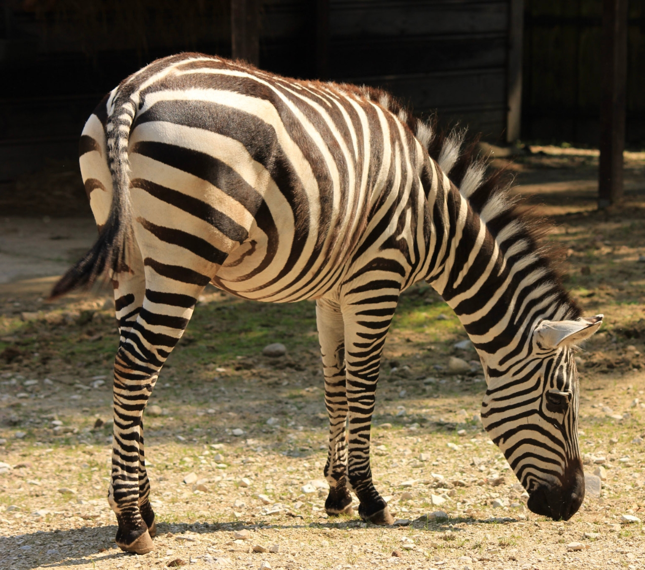 Biało-czarne pasy pokrywają głowę, szyję, boki, biodra i kończyny aż do kopyt. Pasy są szerokie i mocno wyodrębnione. Młode osobniki rodzą się białe w brązowe pasy, które z wiekiem ciemnieją.